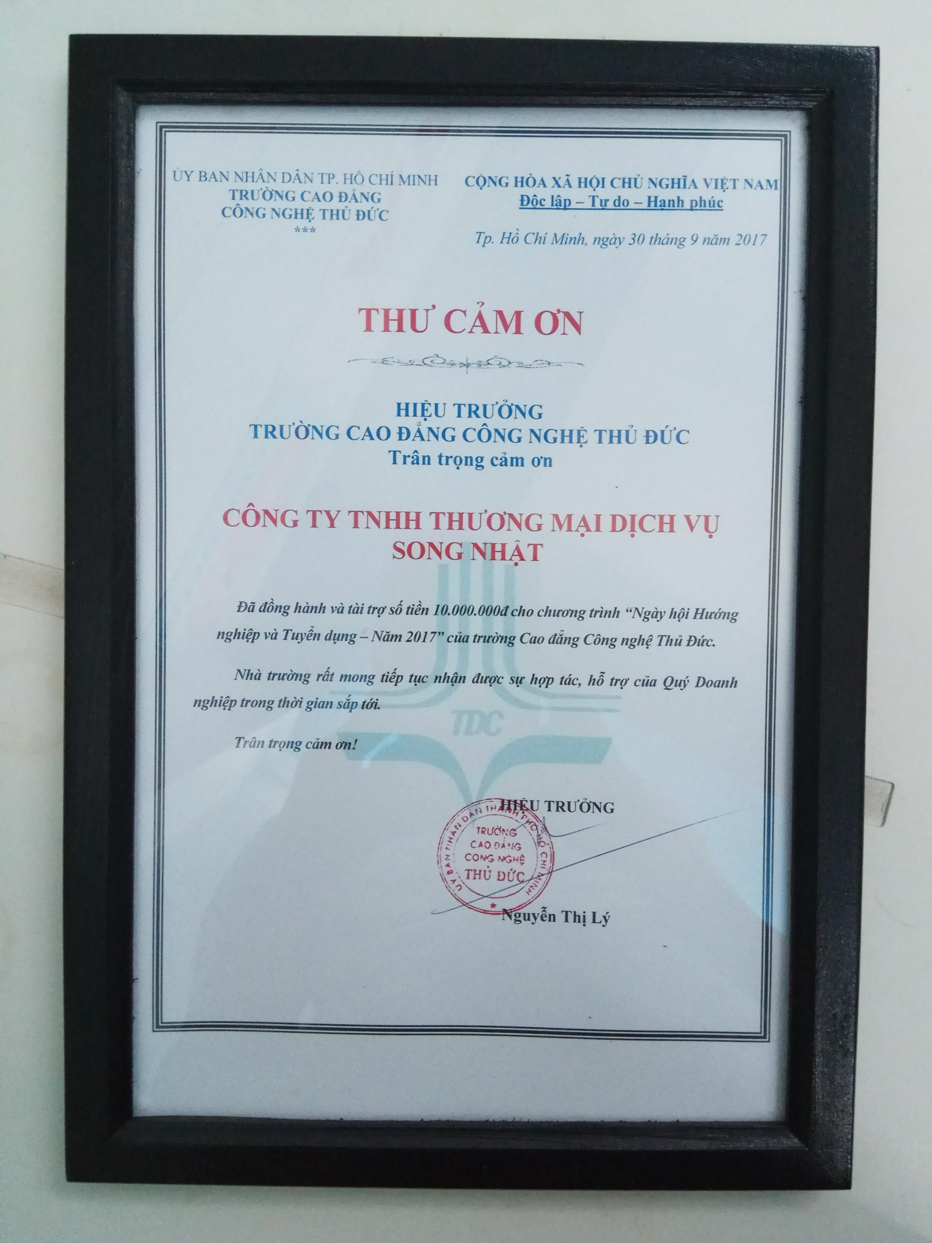 Ngày hội hướng nghiệp – tuyển dụng là hoạt động được Trường Cao đẳng Công nghệ Thủ Đức tổ chức hàng năm, nhằm đưa doanh nghiệp đến nhà trường. Công ty Song Nhật đã tham gia ngày hội và trao học bổng cho sinh viên của trường.